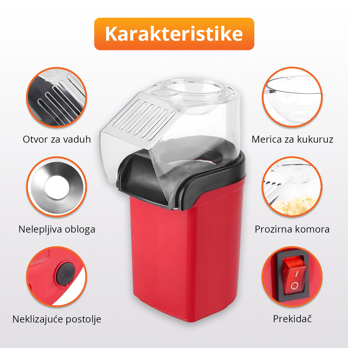 Bez mirisa i dima po celoj kući: Vruć vazduh cirkuliše i ravnomerno zagreva kukuruzna zrna koja će se iskokati bez trunke ulja, što znači da neće biti dima i mirisa po celoj kući.