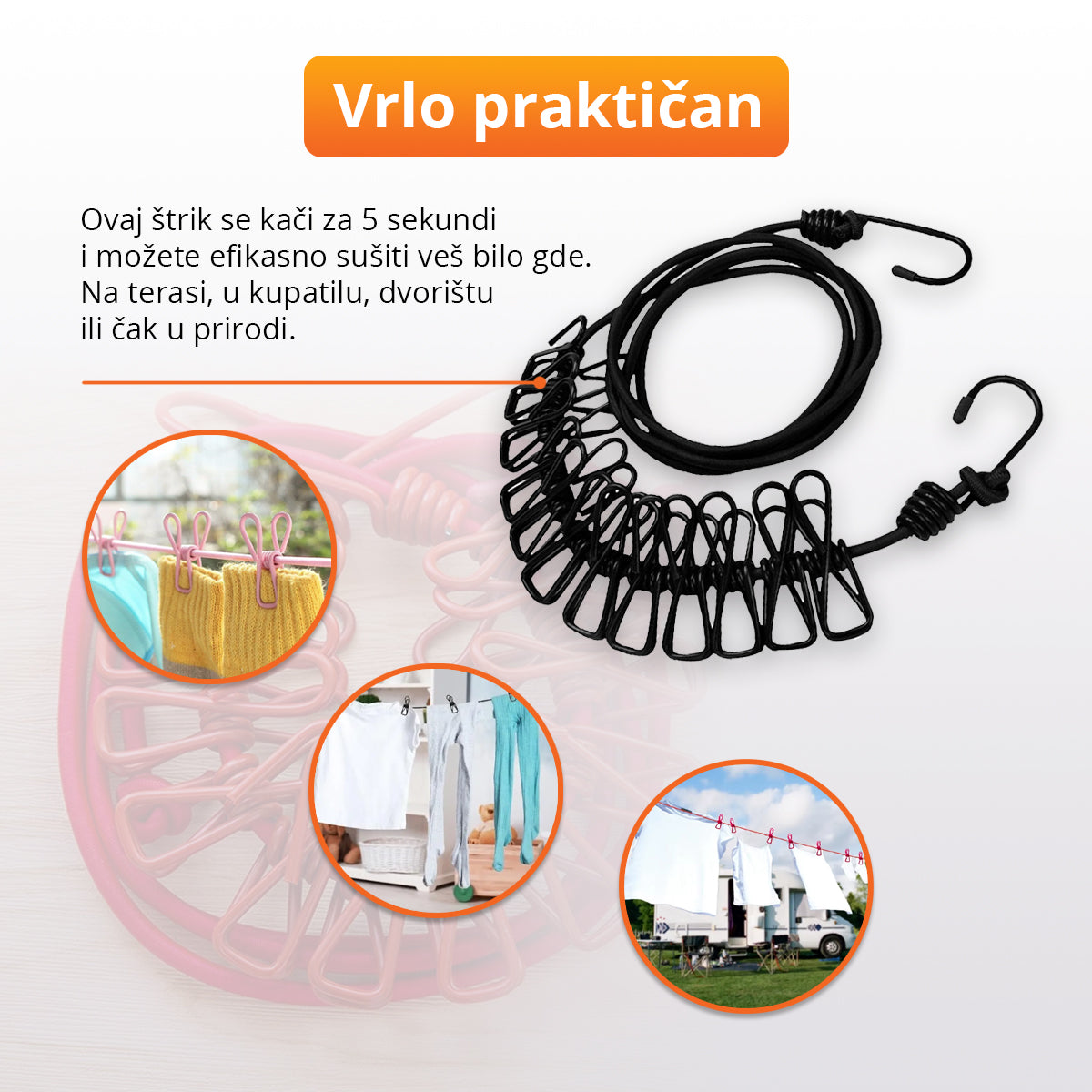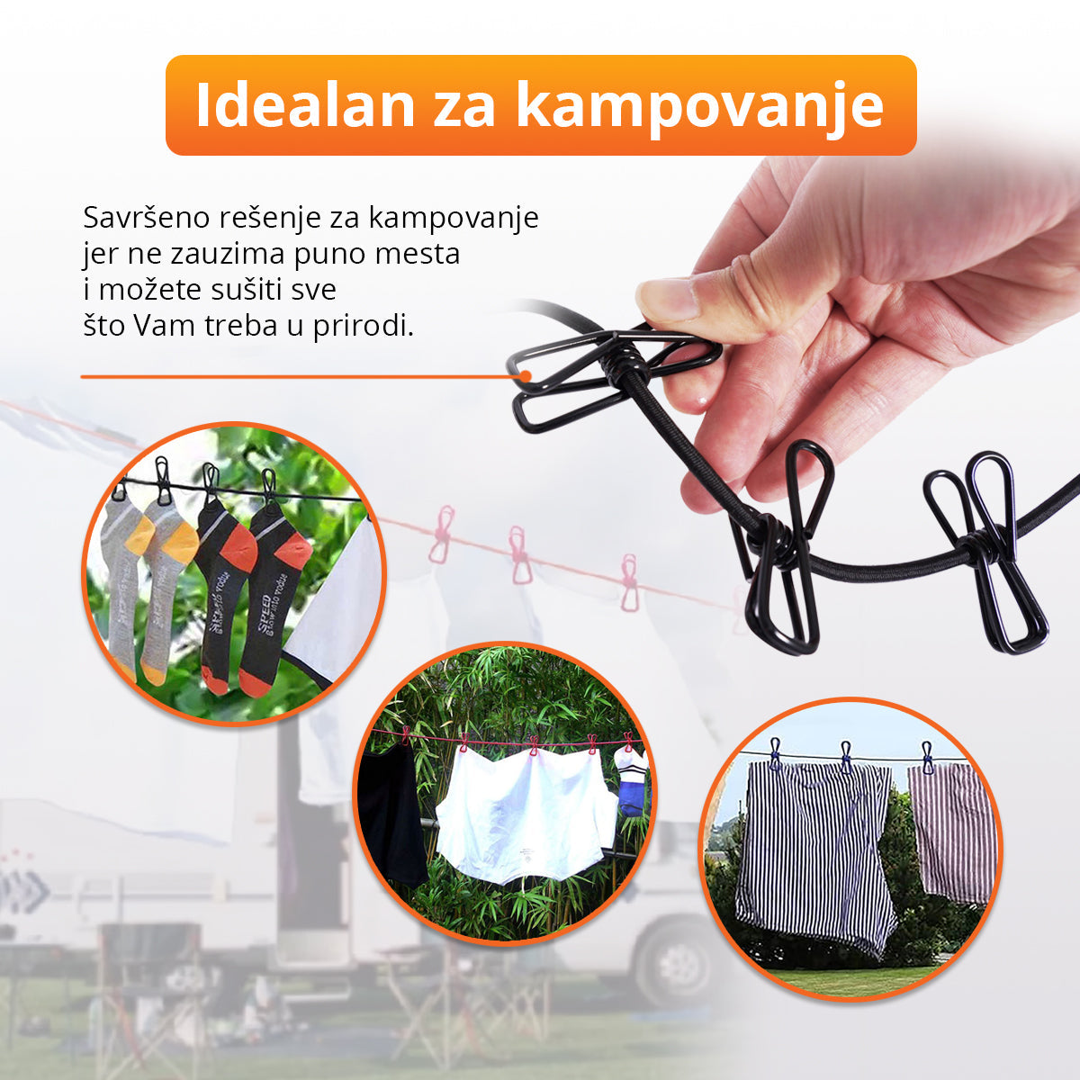 Koristite ga na terasi, u kupatilu, dvorištu ili čak u prirodi. Zaboravite improvizovane i nefunkcionalne žice, ovaj štrik se kači za 5 sekundi i možete efikasno sušiti veš bilo gde.