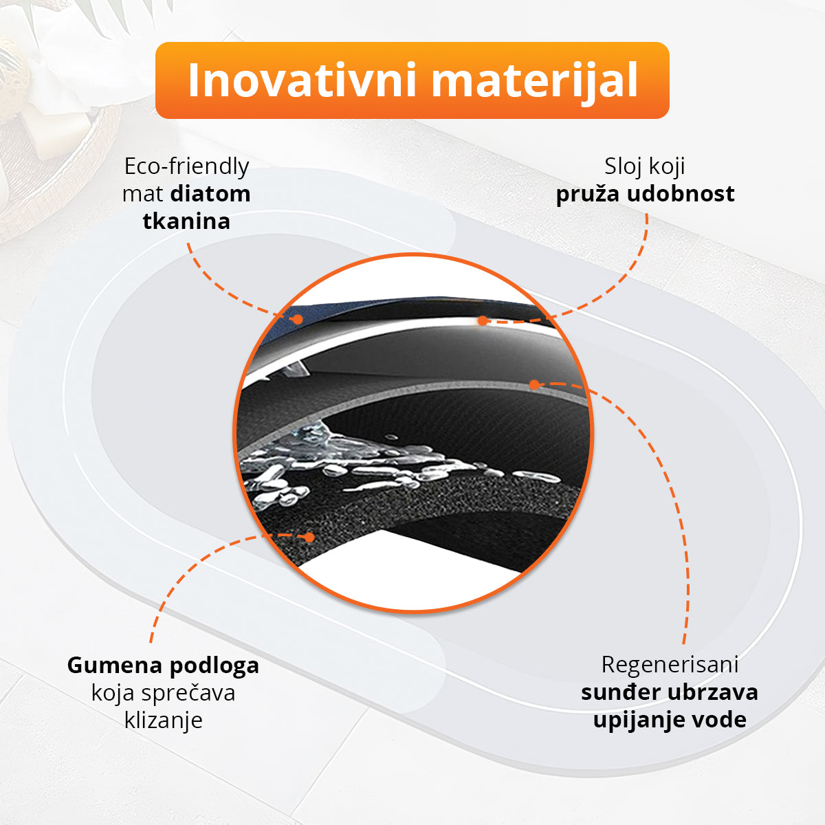 Superbrzo upijanje vode: Naša brzoupijajuća prostirka, napravljena od diatoma, apsorbuje vodu brže nego bilo koji peškir, ostavljajući Vaše kupatilo suvim u roku od nekoliko sekundi nakon izlaska iz tuša. Savršena je za svakodnevnu upotrebu bez čestog menjanja kao što je slučaj sa peškirom ili drugim prostirkama.