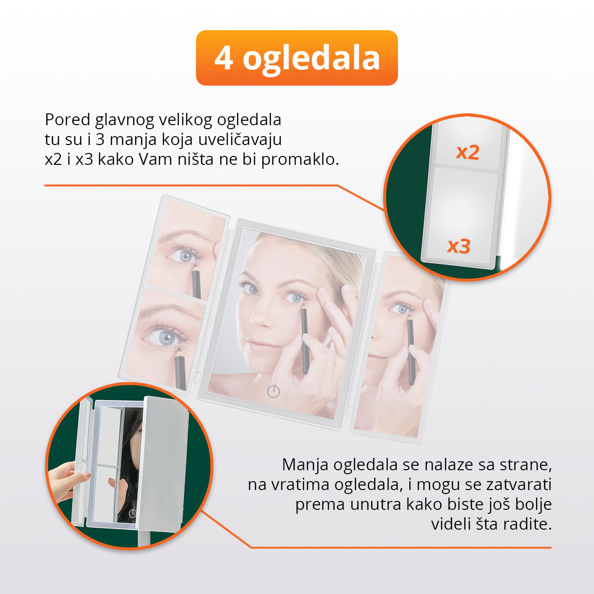 Pored glavnog velikog ogledala tu su i 3 manja koja uveličavaju x2 i x3 kako Vam ništa ne bi promaklo. Manja ogledala se nalaze sa strane, na vratima ogledala, i mogu se zatvarati prema unutra kako biste još bolje videli šta radite.
