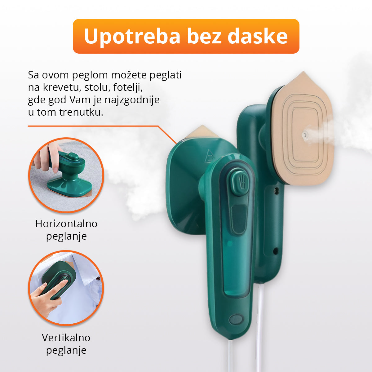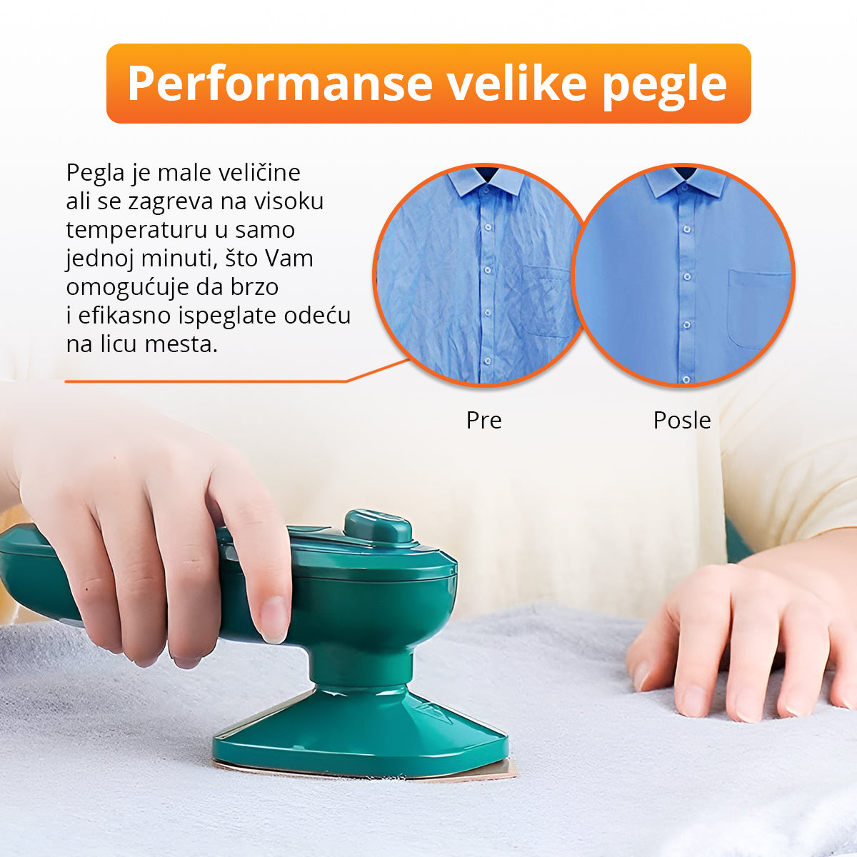 Zaboravite na rasklapanje glomazne daske da biste ispeglali jednu majicu. Sa ovom peglom možete peglati na krevetu, stolu, fotelji, gde god Vam je najzgodnije u tom trenutku.