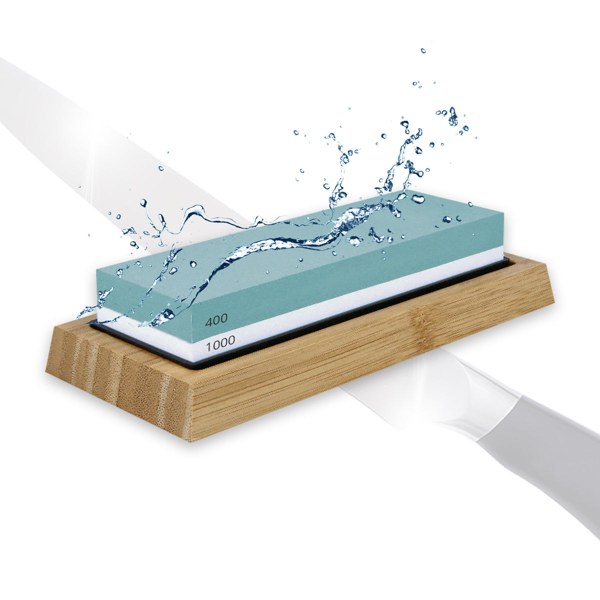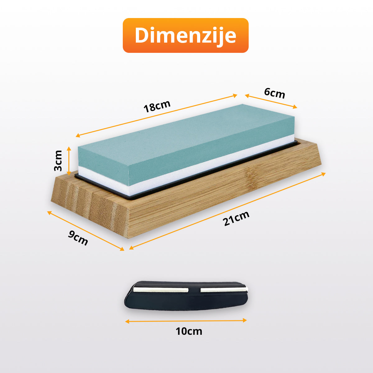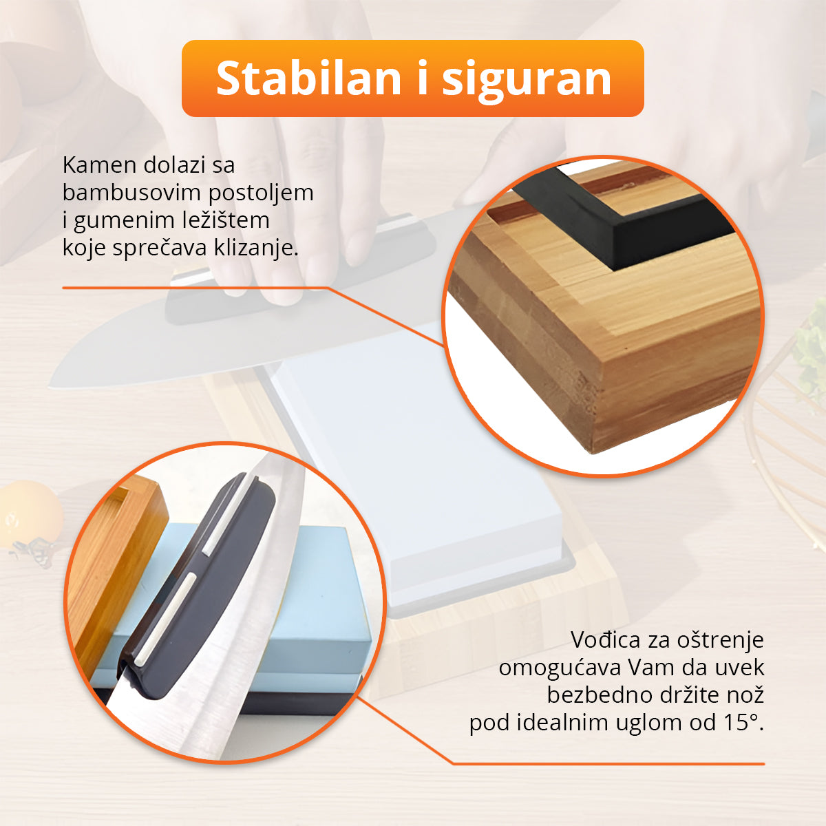Kamen dolazi sa bambusovim postoljem i gumenim ležištem koje sprečava klizanje. Vođica za oštrenje omogućava Vam da uvek bezbedno držite nož pod idealnim uglom od 15°.