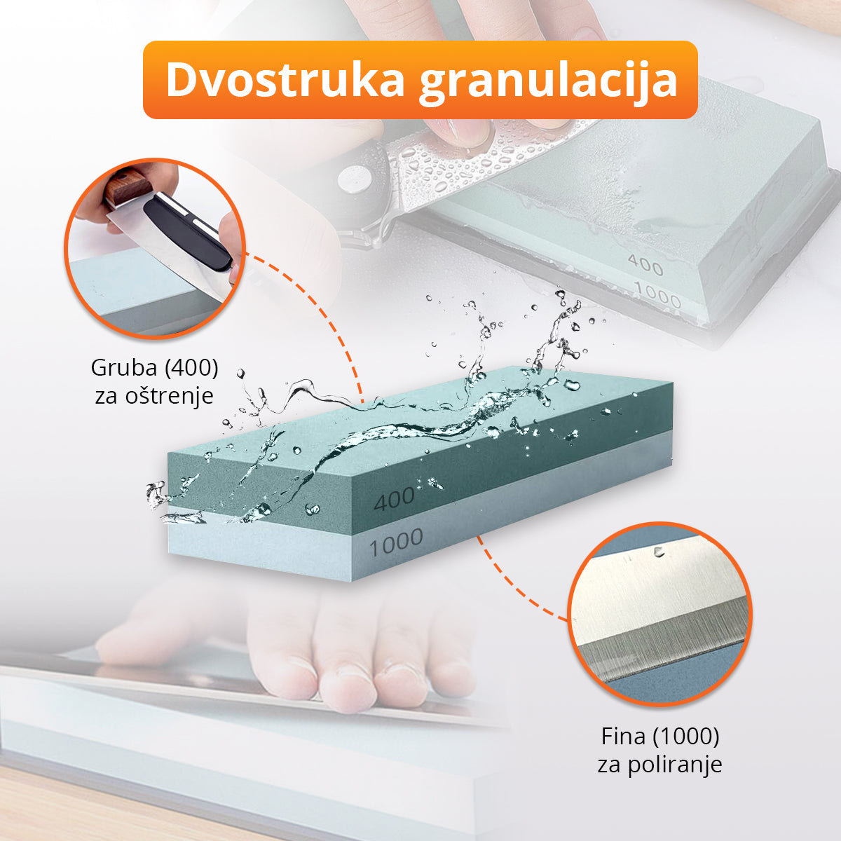 Uz ovaj kamen za oštrenje Vaši noževi će uvek biti savršeno oštri. Dvostruka granulacija - gruba (400) za oštrenje i fina (1000) za poliranje - osigurava preciznu oštrinu svakog sečiva.